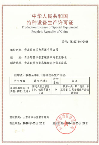 青島信泰壓力容器有限公司成立于2006年,由山東質量技術監督局頒發的D1D2類壓力容器設計許可證和制造許可證;并通過了國家質量管理體系9001認證證書;青島信泰主營的產品有:各類壓力容器,儲氣罐:空氣儲罐,蒸汽儲罐,氧氣儲罐,及各類不銹鋼儲氣罐、油罐等。